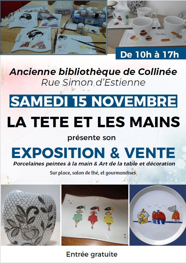 L'association la Tête et les Mains organise à la salle de l'ancienne bibliothèque de Collinée une expo/vente de porcelaines peintes par les adhérentes de l'association. Un salon de thé et de gourmandises sera ouvert toute la journée.
