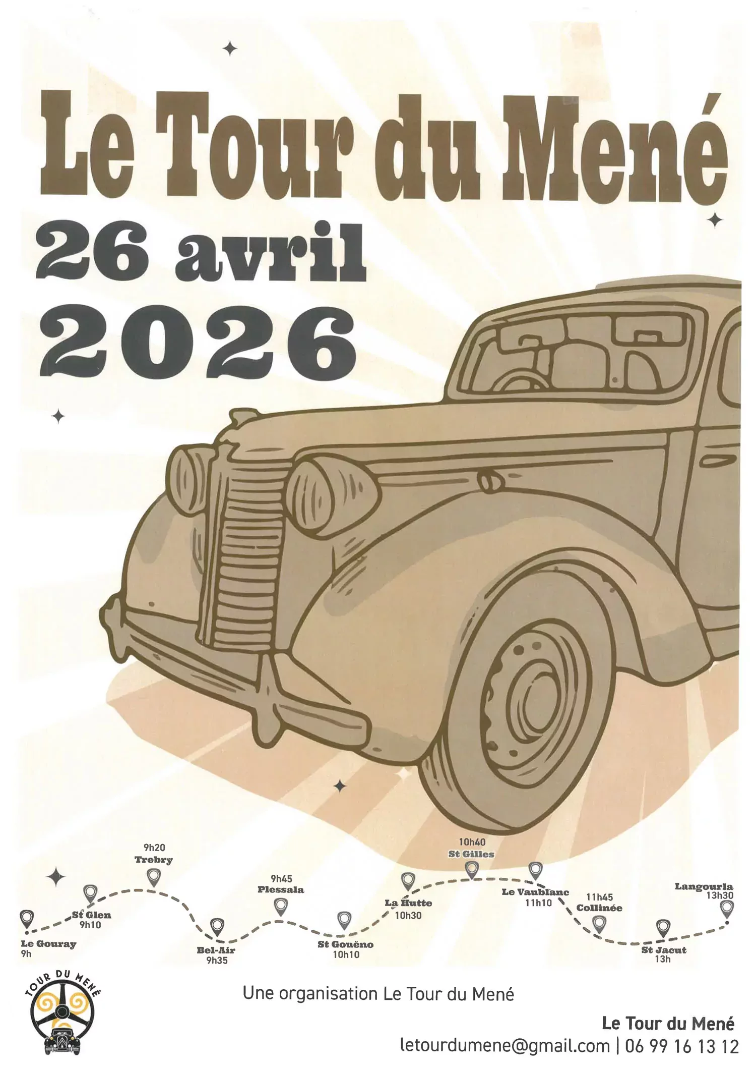Rendez-vous à partir de 8h place de la mairie de Le Gouray pour le café d’accueil, la remise des enveloppes avec, les horaires des étapes et les bons de restauration et boissons pour l’équipage.