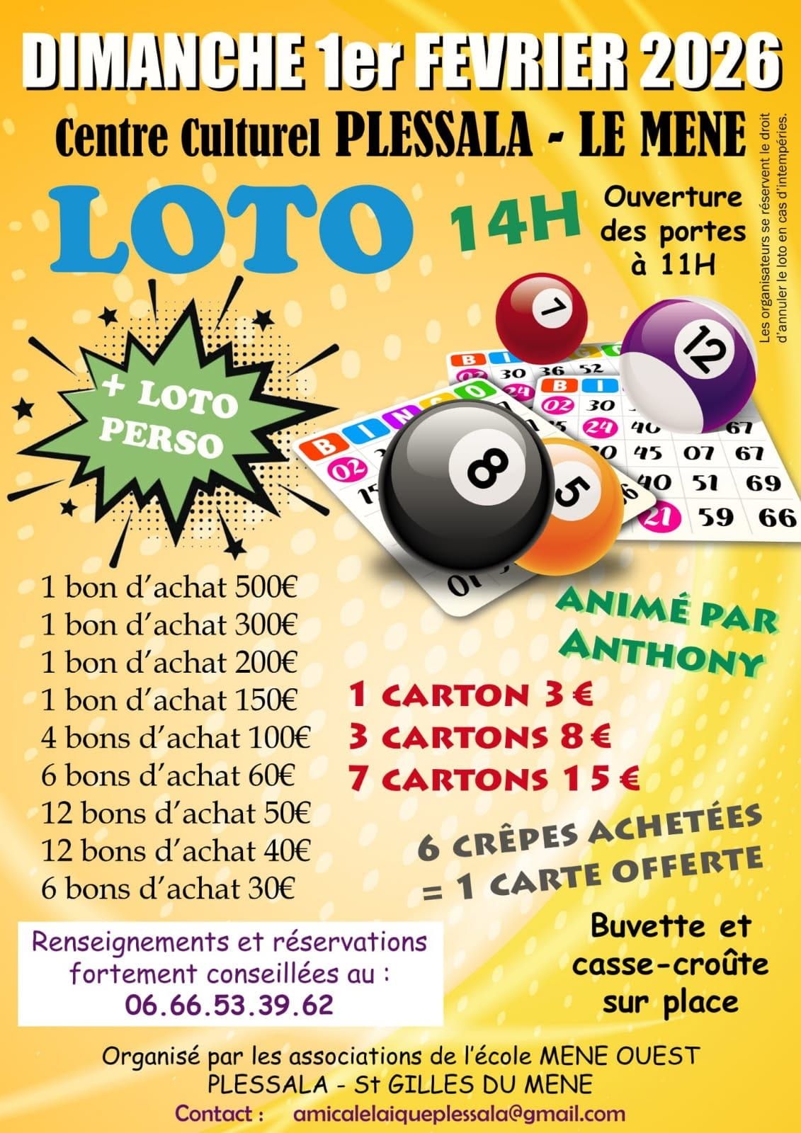 Dimanche 1er Février à 14 h, les associations de l'Ecole Mené Ouest - Plessala/St Gilles du Mené (Amicale Laïque et APE) organisent un loto au Centre Culturel de Plessala animé par Anthony. Buvette, casse-croûte, crêpes et gâteaux sur place, 6 crêpes achetées = 1 carte offerte. Réservation fortement conseillée, n'hésitez pas à réserver votre place dès maintenant ! On vous attend nombreux, venez tenter votre chance !