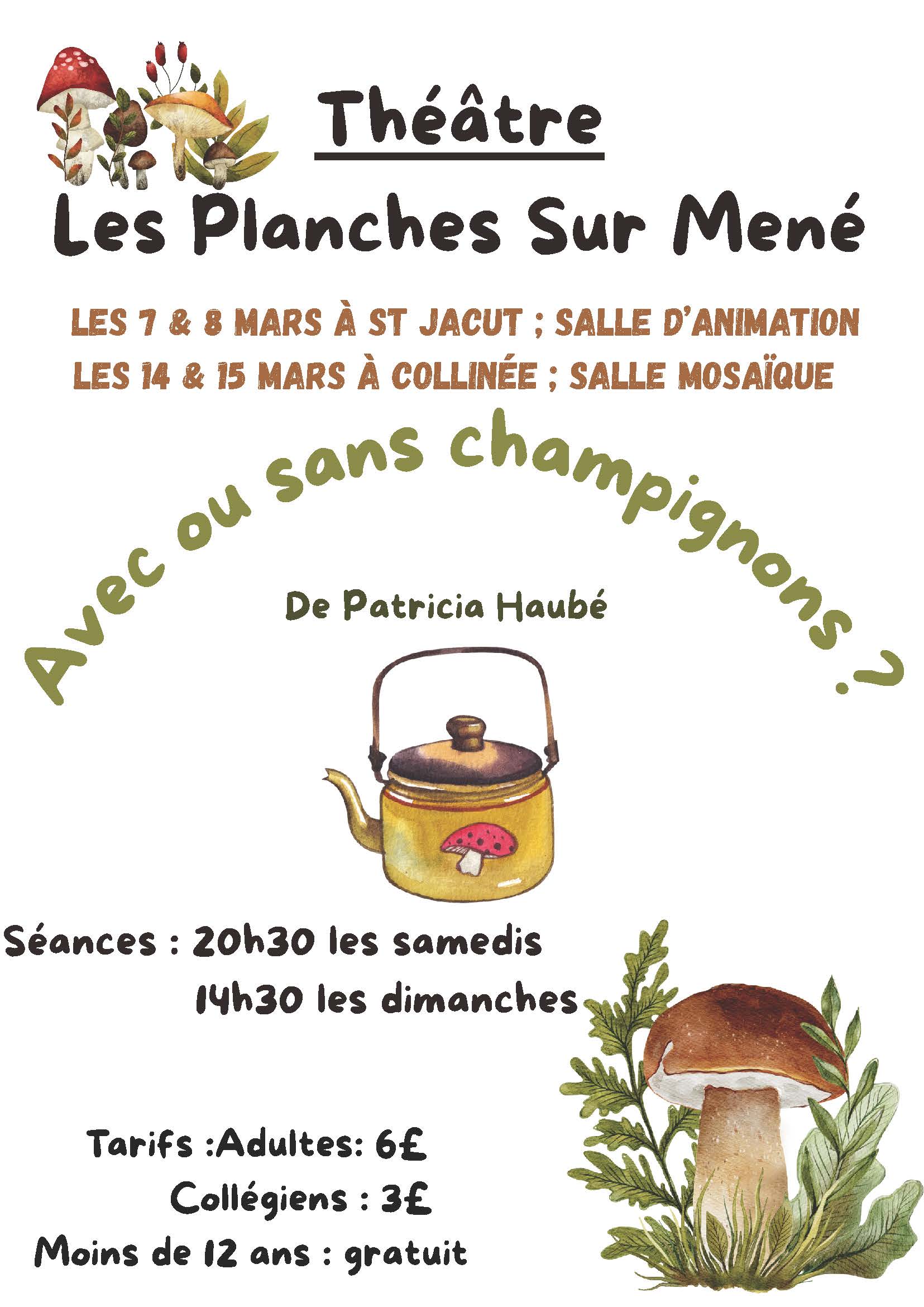 Les Planches Sur Mené à nouveau sur scène pour une pièce inédite " Avec ou sans champignons ? " de Patricia Haubé
